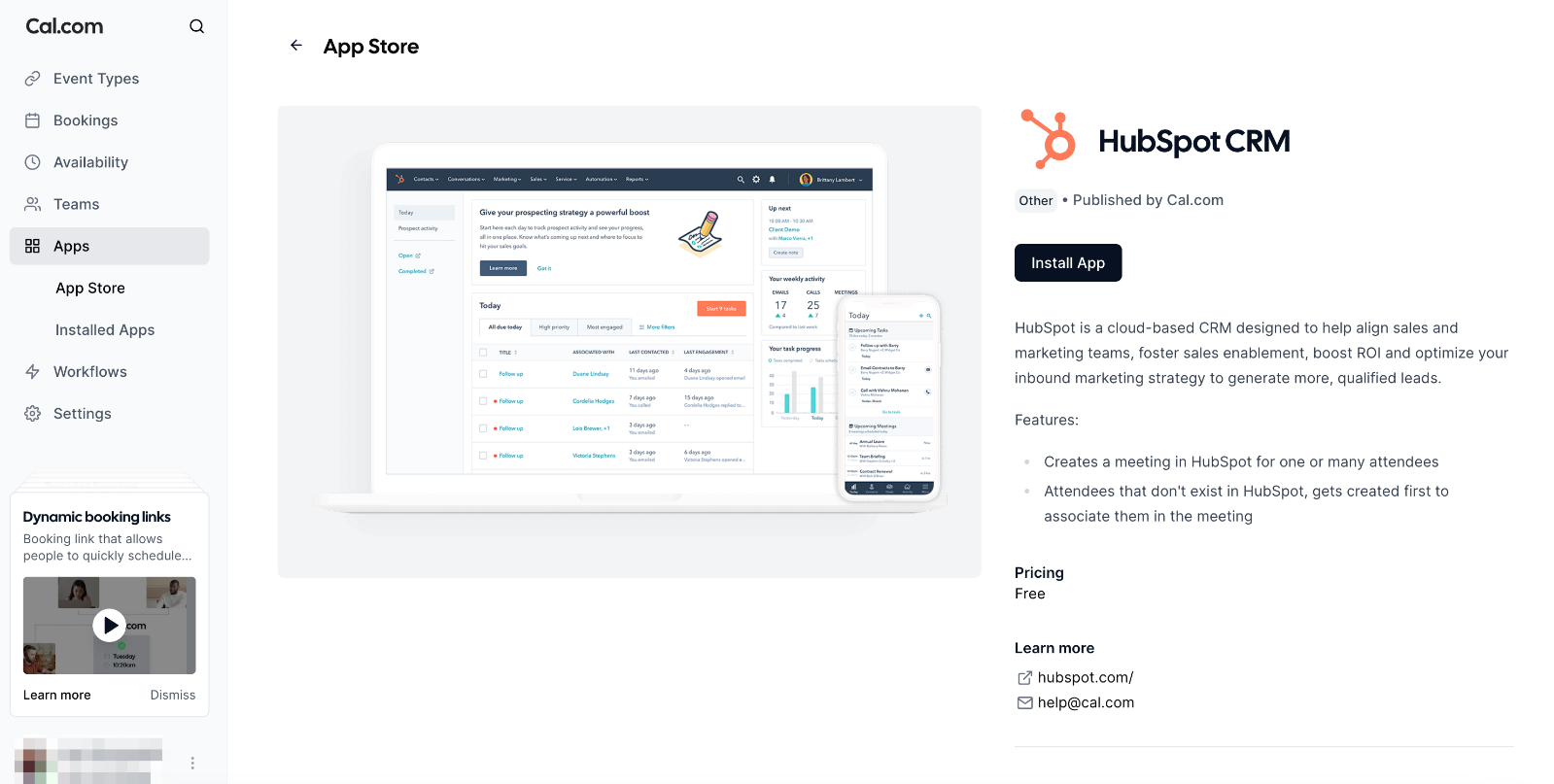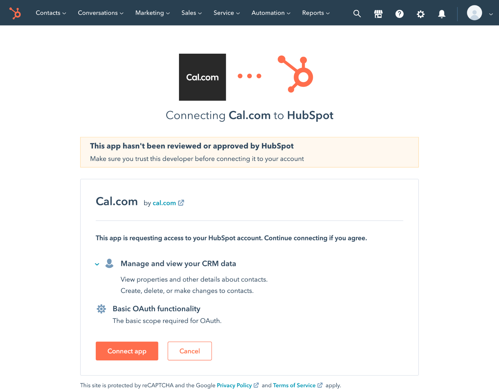 Then, you will need to give the listed permissions to Cal.com clicking the button “Connect app” in order to manage certain aspects of your account, in order to provide you with the functionality you are looking for. By the way, we are making our app official with HubSpot, so you will not be seeing the warning very soon ⬇