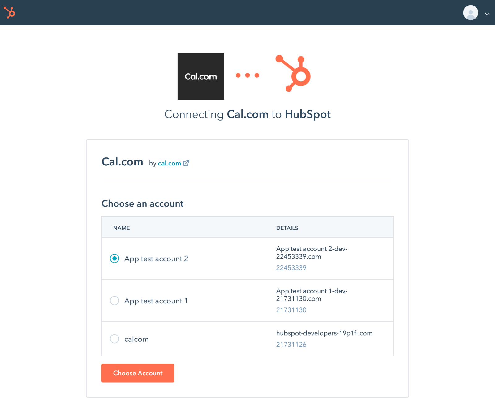 After clicking the “Install” button, you will need to select the HubSpot account you want to use Cal.com with⬇
