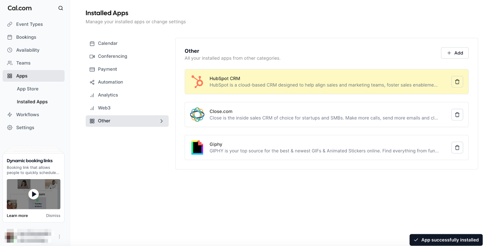 Done! You will be redirected to Cal.com Installed Apps showing your newly installed app ready for you to take advantage of ⬇